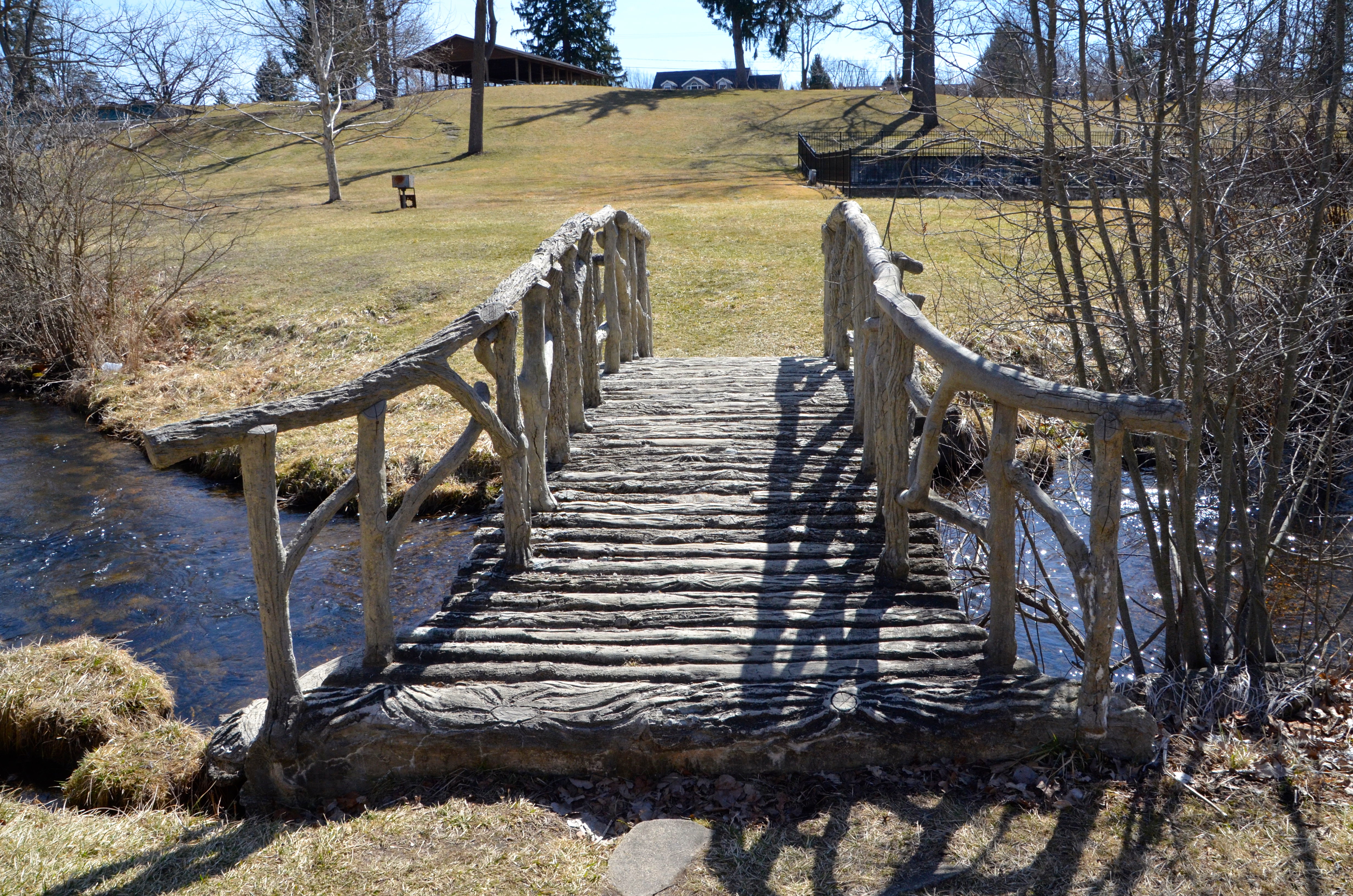 Browse: Home   /   Family Trips   /   Photo Gallery Friday: McCourtie Park and its Cement Wooden Bridges   /   McCourtie Park Michigan Wooden Cement Bridge